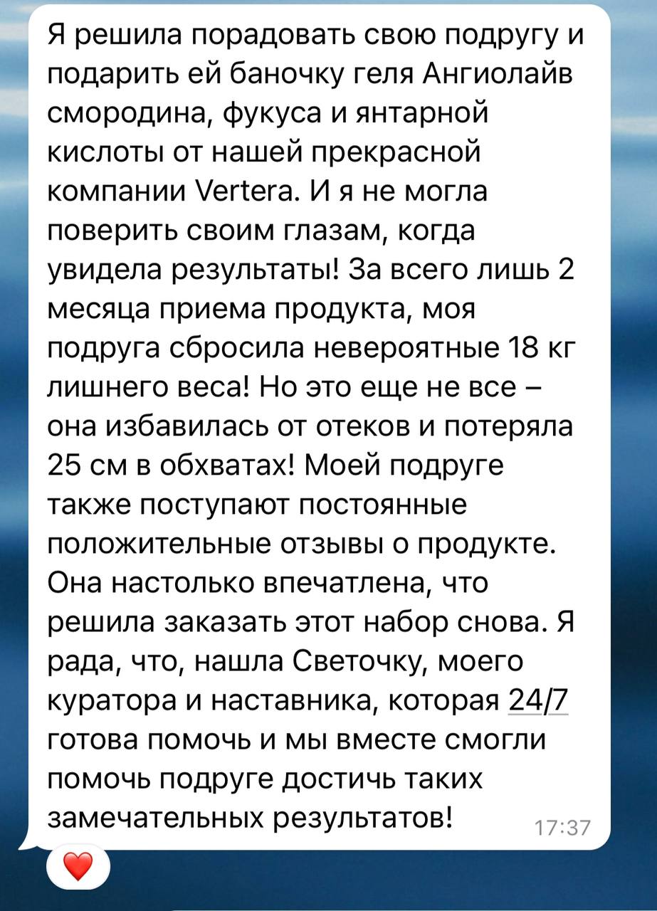 Здравствуйте, хочу поделиться эффектом от нашей продукции. Я ем гели около 2х лет, и работая в школе с детьми заметила что мои простудные болячки стали проходить за 3 дня, НО на днях я восстановилась за сутки, в четверг 28.09 вечером почувствовала слабость недомогание и дискомфорт в ушах и горле. Ночью проснулась от жуткой боли в горле и температуры. В пятницу 28.09 все симптомы ОРВИ исчезли. Я принимала на ночь плазму 2 кап, лиофелизат ангиолайв 2 кап, ночью когда проснулась от боли в горле, помыла его тёплой водой где растворила 1кап плазму. И за пятницу , принимала каждые 2 часа плазму и ангио. Сегодня утром я уехала на учёбу в университет, бодрая и активная. Спасибо VERTERE ❤️❤️❤️